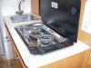 Funktioniert elektrisch über Generator oder mit handelsüblichem Brennspiritus. incl. Microwelle und reichlich Stauraum Stehhöhe auch für Erwachsene Der Boiler benötigt 110V über Landanschluß oder Generator. Nach Angabe des Kranführers wog das Gespann zu diesem Zeitpunkt genau 3628 Kg. Wie sich nachher rausstellte, war der Wassertank randvoll, der Benzintank noch zu einem Viertel, und der US-Trailer war auch fast 100 Kg schwerer als der Harbeck, auf dem das Boot inzwischen steht. Das vorher verbaute Garmin 128 zeigt die Position und den Kurs an, sonst nix. Sicher sehr sparsam im Stromverbrauch, aber ansonsten eher was für Puristen, die immer mit einer Karte auf den Knien in See stechen. Nicht wirklich mein Ding, also mußte ein vernünftiger Kartenplotter her. Recht überschaubar, wenngleich die "Holz"-Oberfläche arg verblasst ist und die vom Werk nachträglich angebrachten Bedienelemente für Ankerwinde und Bugscheinwerfer etwas verloren mitten in der freien Fläche sitzen. Das Werksseitig verbaute Funkgerät ist allerdings nur unter Verrenkungen bedien- und ablesbar. (und hat weder DSC noch ATIS) Das Armaturenbrett wurde komplett neugestaltet. Das Funkgerät ist nach oben neben den Kartenplotter gewandert, die vorher da befindlichen Schalter für Bugscheinwerfer und Ankerwinde nach unten ins Schalterfeld neben dem Lenkrad. Der "Tacho" und das ohnehin nicht mehr ablesbare Echolot sind ersatzlos entfallen, dafür wurde ein Navman 3100 Fuelcomputer eingebaut (der neben dem Verbrauch u.a. auch die Geschwindigkeit anzeigt), sowie zwei 12V-Steckdosen für zusätzliche Geräte (MP3-Player, externes GPS oder sonstwas) eingebaut. Die Wassertiefe (und -temperatur) wird jetzt über den Kartenplotter mit angeschlossenem Fishfinder-Modul angezeigt. Die Abdeckplatten für das Armaturenbrett wurden aus 5mm Plexiglas gefräst und mit Echtholz furniert.