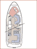 Küche an BB, Sitzgruppe an StB, Vorderkoje