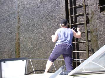in der Schleusenkammer und führt irgendwelche Reparaturarbeiten aus. Wir werden